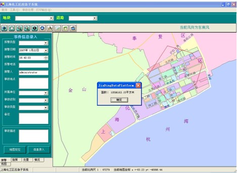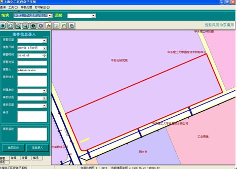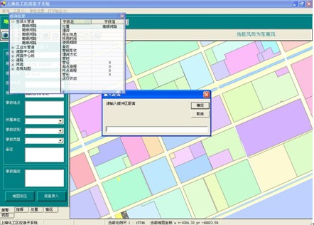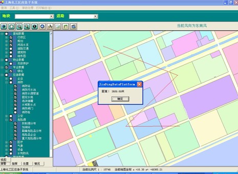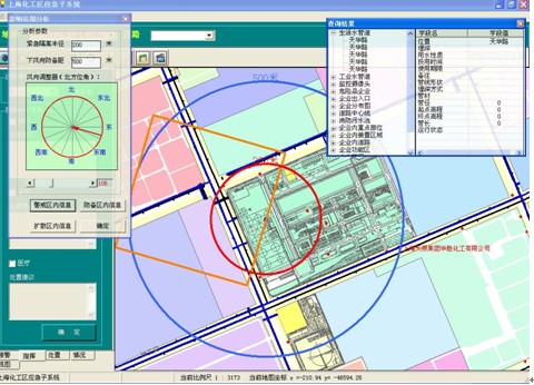 1 影響范圍分析:以當(dāng)前事故點為中心,根據(jù)功能窗口上的“緊急隔離半徑”和“下風(fēng)向防備距離”在地圖上生成影響范圍效果圖,紅圈表示緊急隔離范圍,藍(lán)圈表示防備距離,根據(jù)風(fēng)向的設(shè)置,以黃框表示的防備區(qū)也將不斷進(jìn)行變化??赏ㄟ^功能窗口上的信息顯示按鈕,分別查詢?nèi)齻€區(qū)域中所有的被影響單位的信息。