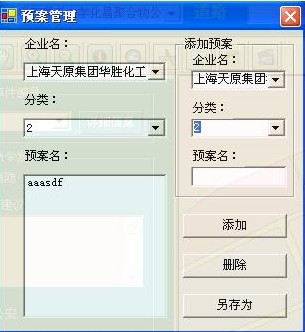 3 預(yù)案管理:該功能用于對各企業(yè)的預(yù)案進(jìn)行管理,當(dāng)發(fā)生事故時可根據(jù)各單位的各個分類快速便捷地查詢預(yù)案。在功能窗口中,選擇企業(yè)名和該企業(yè)的分類名,下方列表中顯示與其相關(guān)聯(lián)的預(yù)案,雙擊預(yù)案名即可打開查看該預(yù)案。右邊的添加預(yù)案功能中,選擇企業(yè)名并設(shè)置分類,選擇“添加”按鈕,便可將選中的預(yù)案添加到數(shù)據(jù)庫,供下次調(diào)用查看。